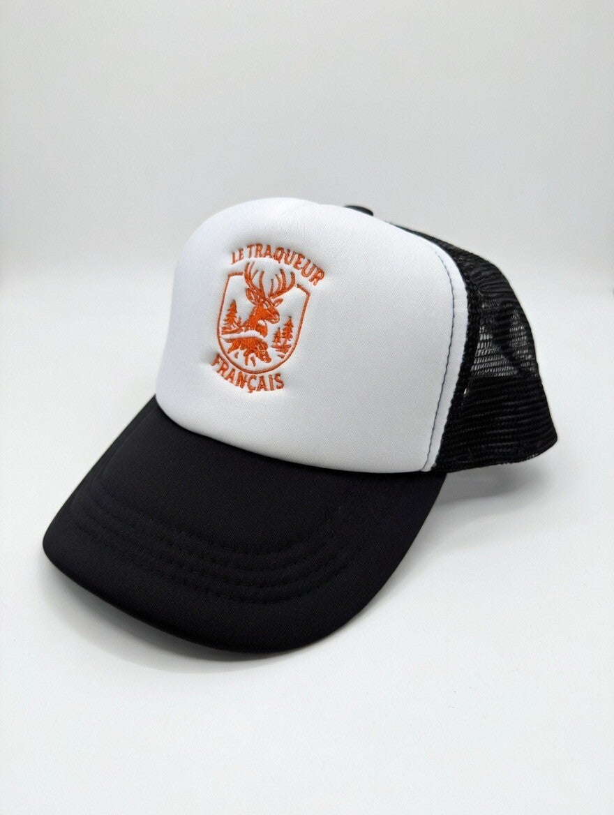 La face avant blanche met en valeur une broderie soignée représentant l’univers du Traqueur Français, avec un cerf emblématique et des détails précis en finition orange. Le contraste avec la visière noire et le filet arrière apporte une touche moderne et dynamique.